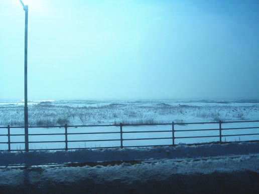 2月15日金曜日。晴天だが風がある。釧路から白糠(しらぬか)に向かう途中の海岸に打ちつける波の高さに驚く。いまにも呑み込まれそうではないか。日本海とはまた全然違う、極寒の北国の海辺の風景。