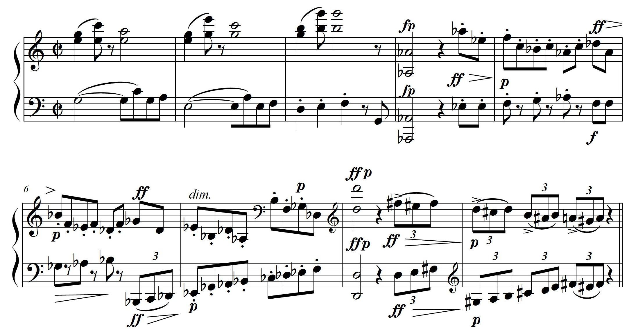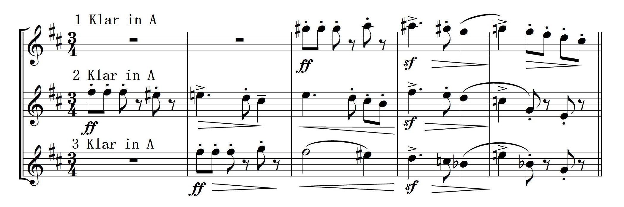 とっても独創的な和声の一例として、第3楽章43小節からのクラリネット3本などは、機能和声法が持つ進行や展開などを無視して音が重なり合い、もう無調的と言っても良いのだけれど (譜例は実音で書いてあります)、これがギリギリのところでカッコ良いんだよね。