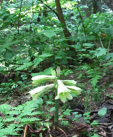 帰り道、妻が発見した。森の中のあちらこちらに野生の百合が咲いているのだ!それも、とても不思議な生え方をしている。まるで地面にむき出しになった水道管のような根だか茎だかがずっと伸びていて、あることろで直角に曲がって天を向き、房のようになって複数の花を咲かせる。