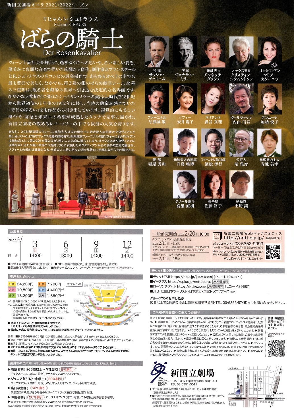 全体は喜劇タッチで、小ネタのギャグに満ちていてナンセンスな場面も多いが、ウィーン貴族社会のバカバカしさが風刺的に描かれている。一度は、観るに値するオペラだ。それがジョナサン・ミラーの演出で観れる内に、新国立劇場に足を運んでくださいね。
